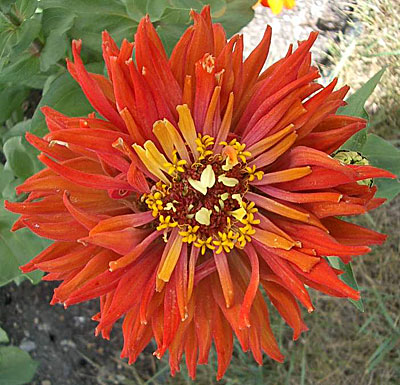 Соцветия кактусовидные, махровые, диаметром до 10 см, ярко оранжевого цвета. Предпочитает солнечные места и плодородные почвы. Любит обильный полив.