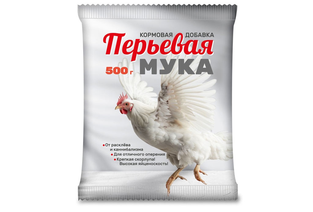Перьевая мука — высокобелковая кормовая добавка для прекращения и профилактики расклева (каннибализма), улучшения состояния пера, пуха и кожных покровов у всех видов молодняка и взрослой птицы: кур, индеек, цесарок, перепелов, гусей и уток.